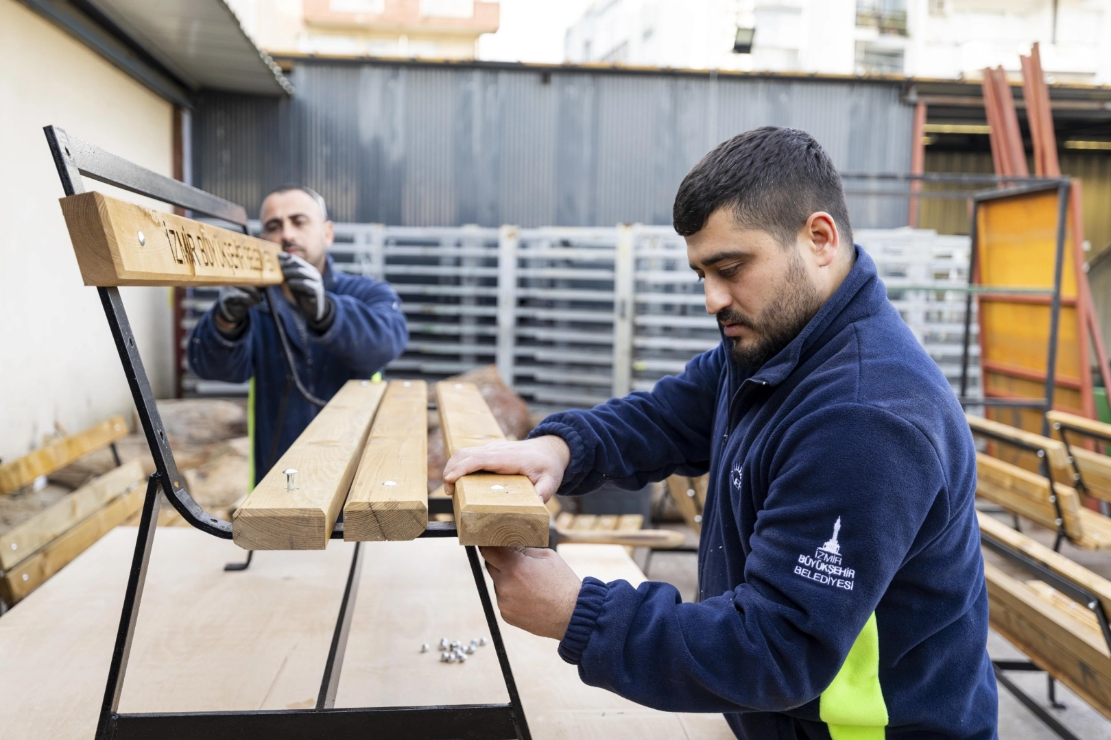 Park ve Bahçeler Dairesi Başkanlığı'na bağlı Buca'daki Fırat Atölyesi, kent mobilyalarından uyarı levhalarına kadar çok sayıda donatıyı üretiyor. Atölye Şefi Mete Kalaç, bank, çöp kovası, piknik masası, oturma ve oyun grupları gibi ekipmanların üretildiğini belirtiyor. Ayrıca, budama sırasında elde edilen tomruklardan da bank ve masa üretimi yapılıyor.