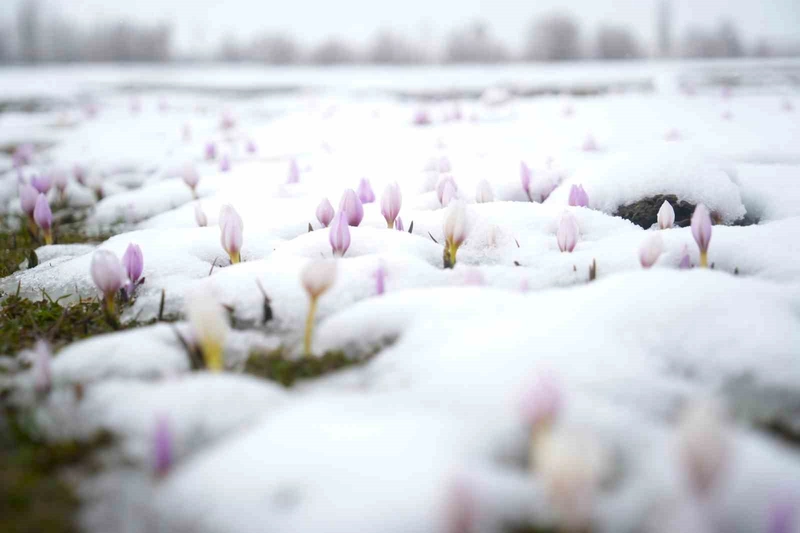Baharın habercisi çiğdemler kar altında kaldı