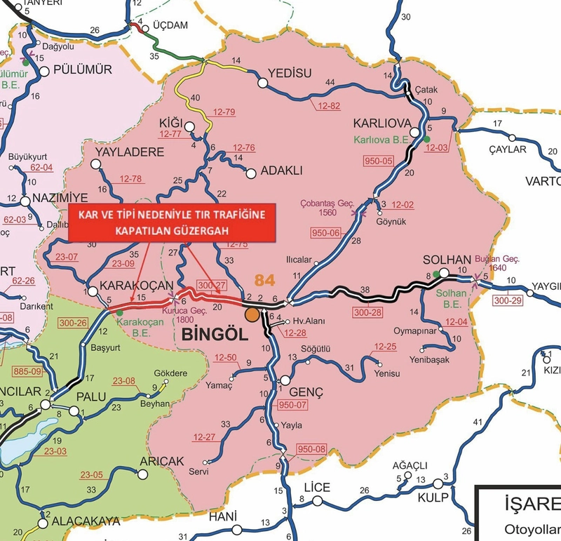 Bingöl-Elazığ karayolunun 0-51 kilometreleri arasındaki bölüm, tır trafiğine kapatıldı. Bu karar, yolun iki önemli noktası olan Bingöl Sancak kavşağı ile Karakoçan ayrım kavşağı arasındaki güzergahı etkiliyor.