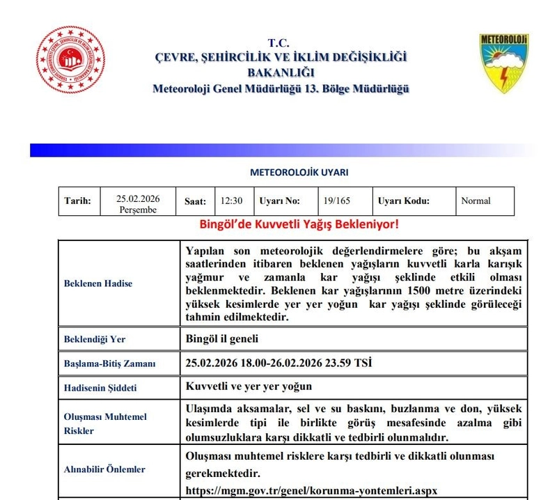 Meteoroloji 13. Bölge Müdürlüğü, Bingöl için kuvvetli yağış uyarısı yaptı.