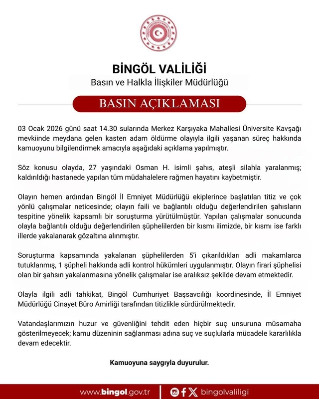 Bingöl'ün merkez Karşıyaka Mahallesi Üniversite Kavşağı'nda, 03 Ocak 2026 günü saat 14.30 sularında kasten adam öldürme olayı meydana geldi. Olay yerinde, 27 yaşındaki Osman H. ateşli silahla yaralandı. Kendisine yapılan tüm müdahalelere rağmen kaldırıldığı hastanede hayatını kaybetti.