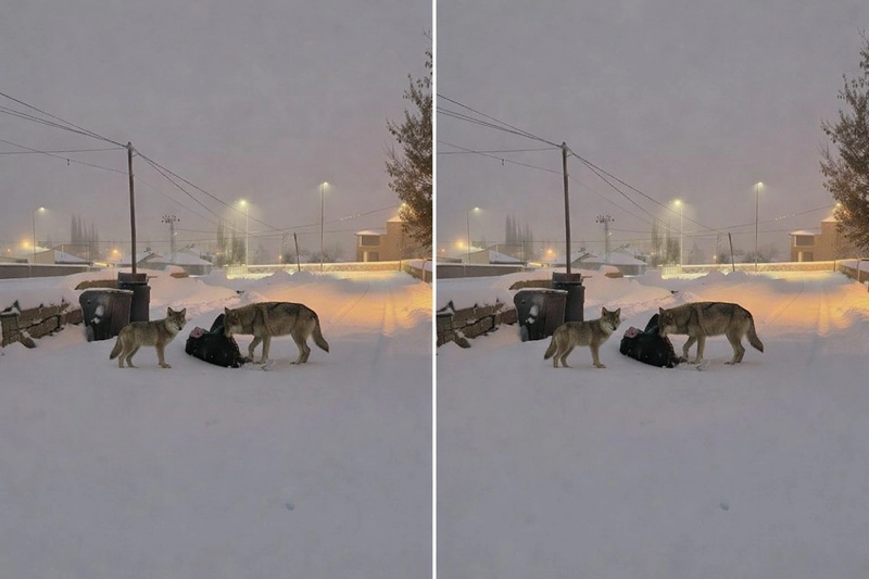 Kar kalınlığının artması ve doğada besin bulmanın giderek zorlaşması, kurtları yerleşim yerlerine çekti. Bir sokak üzerinde yiyecek ararken cep telefonu kamerasıyla kaydedilen kurtlar, karla kaplı yolda uzun süre dolaştı ve çevreyi kontrol etti. Kayıtlar, hayvanların mahalle içindeki varlığını net bir şekilde gözler önüne serdi.