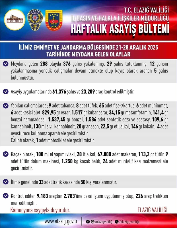 Elazığ Valiliği, 21-28 Aralık 2025 tarihlerini kapsayan haftalık asayiş bültenini kamuoyu ile paylaştı. Bültene göre, kent genelinde bir hafta içerisinde toplam 288 asayiş olayı meydana geldi. Bu olaylarla bağlantılı olarak 376 şahıs yakalandı ve 29 şahıs tutuklandı. Güvenlik güçleri, çalışmalar kapsamında 61 bin 376 şahıs ve 23 bin 209 aracı denetledi.