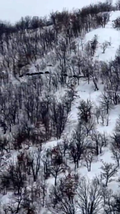 Elazığ'ın Palu ilçesine bağlı Gökdere köyü kırsalında, karların üzerinde ilerleyen büyük bir domuz sürüsü görüntülendi. Sürüyü fark eden bir şahıs, o anları cep telefonu kamerasıyla kayıt altına aldı.