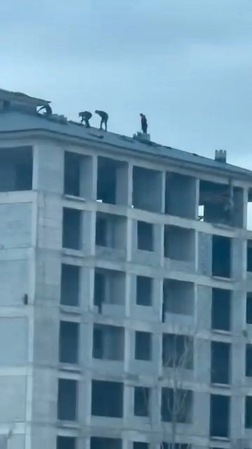 Elazığ'da, İstasyon Caddesi'nde bulunan 10 katlı bir inşaatın son katında çalışan işçiler, hiçbir güvenlik önlemi almadan görüntülendi. Can güvenliklerini hiçe sayarak uzun süre bu şekilde çalıştıkları belirlendi.