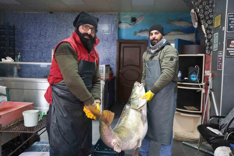 Yakalanan dev turna balığını iki kişinin zorlukla taşıdığı görüldü. Et halinde temizlenen balığın kilosu 500 liradan alıcılarını bekliyor. Balıkçı Ramazan Erdoğan, balığı Murat Nehri'nde yakaladıklarını belirtti.
