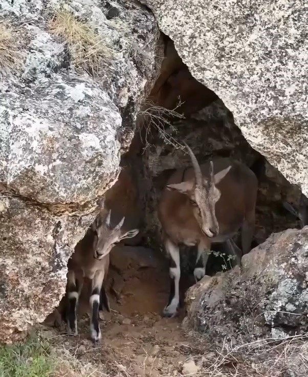 Drone kamerasına yansıyan sahnelerde, üç dağ keçisinin kayalıklar arasındaki küçük bir kovukta bir süre çevreyi gözlemlediği görüldü. Keçi ailesi, bu doğal sığınağı kullanarak etraflarını kontrol etti.