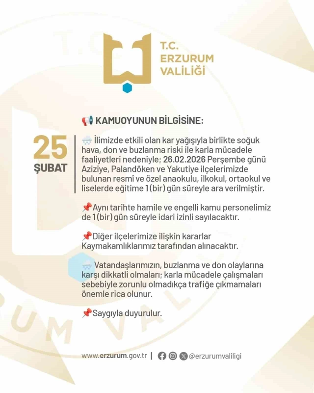 Erzurum Valisi Aydın Baruş, sosyal medya hesabı üzerinden yaptığı paylaşımda kararın detaylarını kamuoyuna duyurdu. Baruş, "26.02.2026 Perşembe günü Aziziye, Palandöken ve Yakutiye ilçelerimizde bulunan resmî ve özel anaokulu, ilkokul, ortaokul ve liselerde eğitime bir gün süreyle ara verilmiştir" ifadelerini kullandı.