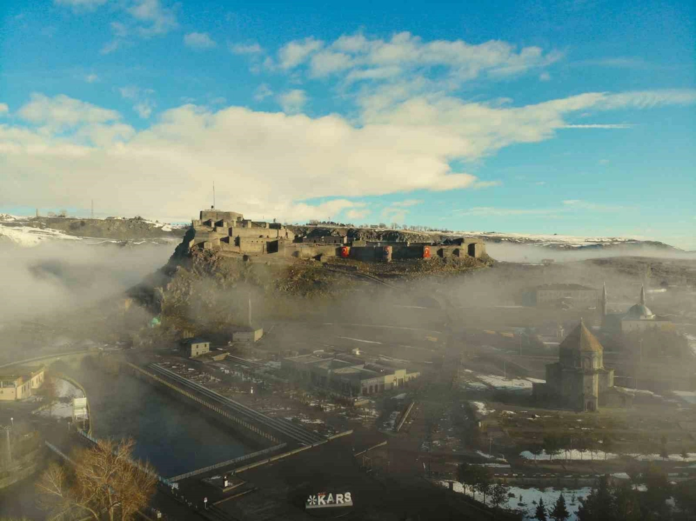 Kent merkezine hakim konumda bulunan Kars Kalesi, sis bulutlarının arasında zaman zaman görünmez hale geldi. Aynı karede yer alan tarihi kilise ve Evliya cami ise sisin arasından siluet şeklinde belirdi. Ortaya çıkan görüntüler, kentin tarihi dokusunu farklı bir atmosferle buluşturdu.