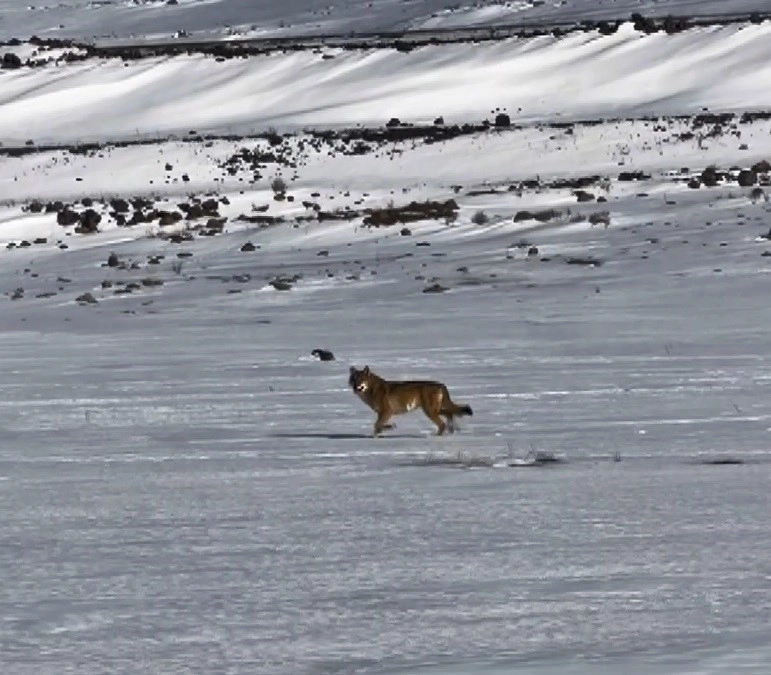 Kars-Çıldır karayolunda öğle saatlerinde seyir halindeki bir sürücü, karla kaplı arazide kendisini takip eden bir kurdu fark etti. Kar yağışı ve dondurucu soğuk nedeniyle yiyecek bulmakta zorlandığı tahmin edilen kurt, yol kenarına kadar inmişti.