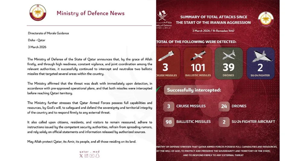 Katar hükümetinden, İran’dan gerçekleştirilen saldırılarla ilgili yeni açıklama geldi. Katar Savunma Bakanlığı, ülkenin 2 balistik füze saldırısının daha hedefi olduğunu duyurarak, "Tehdit tespit edilir edilmez önceden onaylanmış operasyonel planlara uygun olarak derhal ele alınmış, her iki füze de de Katar topraklarına ulaşmadan engellenmiştir" ifadelerine yer verildi. Yapılan bir diğer açıklamada ise şimdiye dek 3 seyir füzesi, 98 balistik füze, 24 İHA ve 2 Su-24 savaş uçağının etkisiz hale getirildiği aktarıldı.