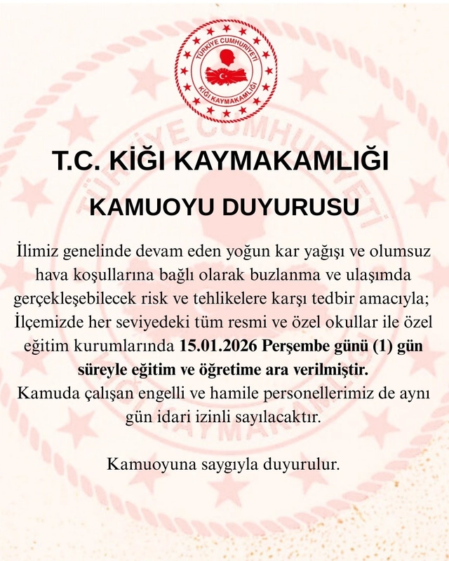 Yapılan açıklamada, 15 Ocak 2026 Perşembe günü ilçe genelinde eğitime bir gün ara verildiği duyuruldu. Aynı gün, kamuda çalışan hamile ve engelli personel de idari izinli sayılacak.