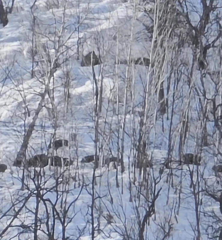 Yoğun kar örtüsüyle kaplanan bölgede sürü halinde dolaşan domuzların, kar altındaki besinlere ulaşmaya çalıştığı anlar dikkat çekti. Bir süre yiyecek arayan domuz sürüsü daha sonra gözden kayboldu.