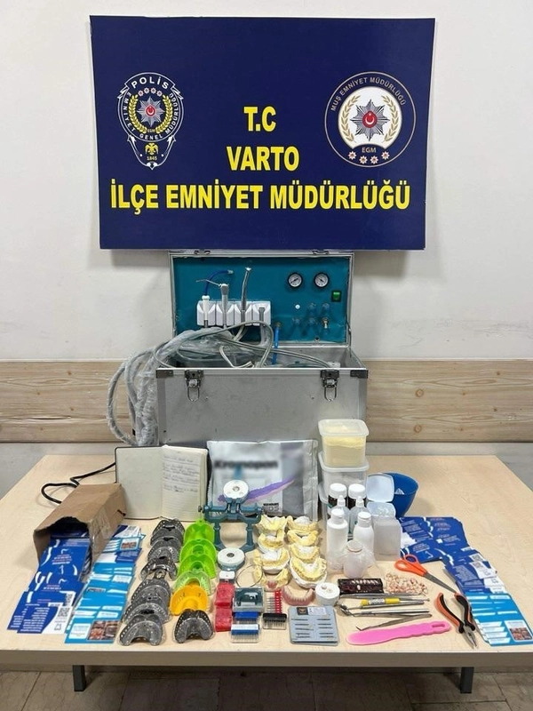 Varto İlçe Emniyet Müdürlüğü ekipleri, 19 Ocak'ta gerçekleştirdiği operasyonda adrese girdi. Yapılan aramada, diş kompresörü, diş kalıpları, takma dişler, diş aynaları, yapıştırıcılar, ölçü malzemeleri ve bir müşteri defteri de dahil olmak üzere çok sayıda dişçilik ekipmanı ele geçirildi.