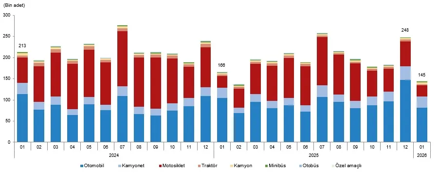 Türkiye İstatistik Kurumu (TÜİK) tarafından yayımlanan Motorlu Kara Taşıtları, Ocak 2026 bültenine göre, Ocak ayında 144 bin 620 adet taşıtın trafiğe kaydı yapıldı. Trafiğe kaydı yapılan taşıtların yüzde 56,1’ini otomobil, yüzde 18,7’sini motosiklet, yüzde 18,4’ünü kamyonet oluşturdu.