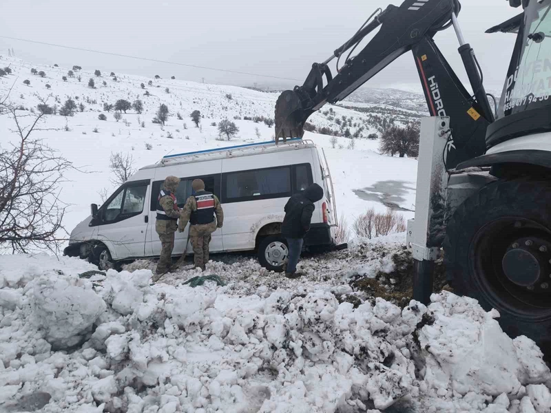 Elazığ’da yoğun kar yağışından dolayı şarampole sürüklenen minibüs, jandarma ve il özel idaresi ekipleri tarafından kurtarıldı.