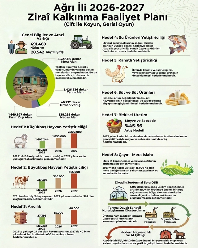 Tarım ve Orman Bakanlığı’nın 2024-2028 Stratejik Planı ile Ulusal Kırsal Kalkınma Stratejisi-IV doğrultusunda hazırlanan "Ağrı İli Zirai Kalkınma Faaliyet Planı" yürürlüğe girdi. Plan, Valilik himayesinde ve koordinasyonunda Tarım ve Orman İl Müdürlüğü başta olmak üzere kamu kurum ve kuruluşları, meslek odaları, birlikler, kooperatifler ve sivil toplum kuruluşlarının katkısıyla hazırlandı.