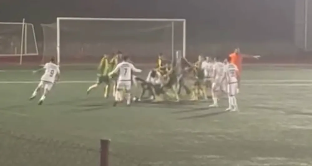 Bir anda savaş alanına dönen sahada futbolcular tekme ve yumruklarla birbirine girdi. O anlar ise maçı izlemek için tribünde bulunan bir vatandaş tarafından cep telefonuyla görüntülendi.
