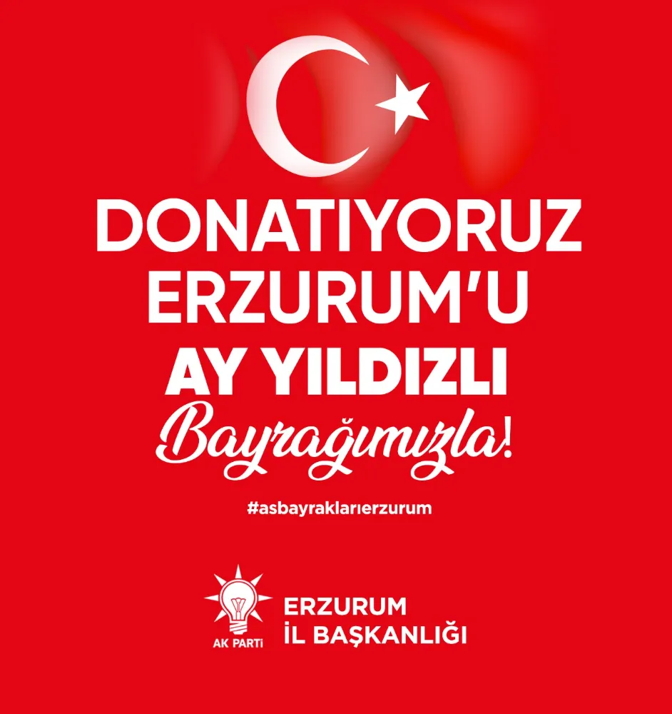 AK Parti Erzurum İl Başkanı İbrahim Küçükoğlu, sınır hattında Türk bayrağının indirilmesine yönelik yaşanan olaya tepki olarak dikkat çeken bir paylaşımda bulundu. Küçükoğlu, “Donatıyoruz Erzurum’u Ay Yıldızlı Bayrağımızla” ifadelerinin yer aldığı görseli sosyal medya hesaplarından paylaşarak birlik ve beraberlik mesajı verdi.