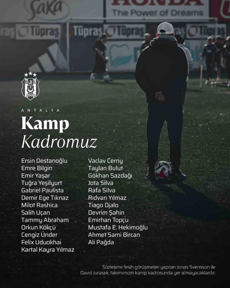 Devre arası çalışmalarını Antalya’da sürdürecek olan Beşiktaş’ta kampa katılacak oyuncuların isimleri belli oldu. Siyah-beyazlılarda sözleşme fesih görüşmeleri yapılan David Jurasek ve Jonas Svensson ile geçtiğimiz hafta futbol planlamasında yer almayacağı açıklanan Necip Uysal, kamp kadrosunda yer almadı.