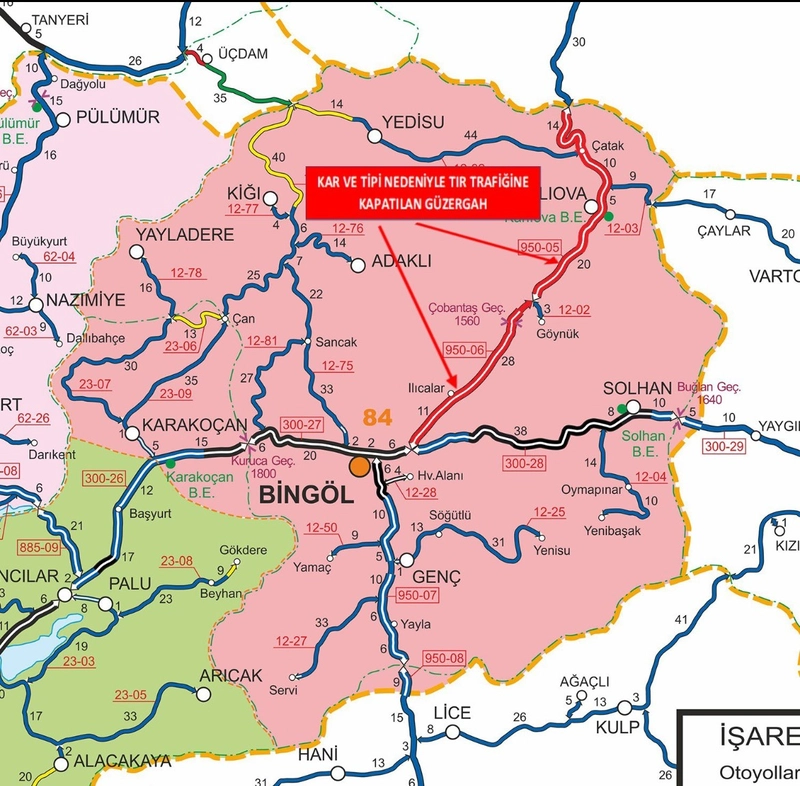 Bingöl Valiliği'nden yapılan açıklamada, "Bingöl-Erzurum Devlet Yolunun 0-88 km’leri arası ( Karvansaray kavşağı ile Bingöl-Erzurum İl sınırı arası) yoğun kar yağışı ve tipi nedeniyle saat 16:55 itibarıyla TIR trafiğine kapatılmıştır" ifadelerine yer verildi. Uygulamanın sürücüler ve can güvenliği için alındığı belirtildi.