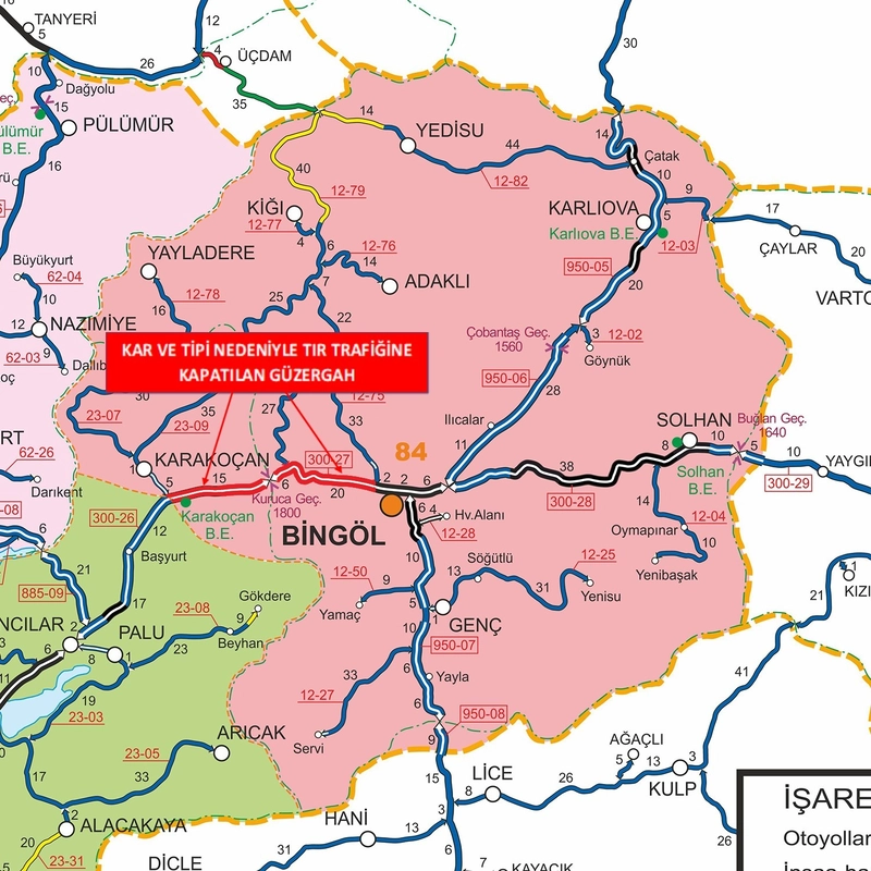 Ayrıca, Bingöl-Elazığ Yolu’nun 0-46 kilometreleri arası da olumsuz hava koşulları sebebiyle geçici olarak ağır taşıt trafiğine kapatıldı. Öte yandan, Karlıova/Kargapazarı İl Yolunun 0-9 kilometreleri arası da yoğun kar yağışı ve tipi nedeniyle saat 16.35 itibarıyla tır trafiğine kapatıldı.