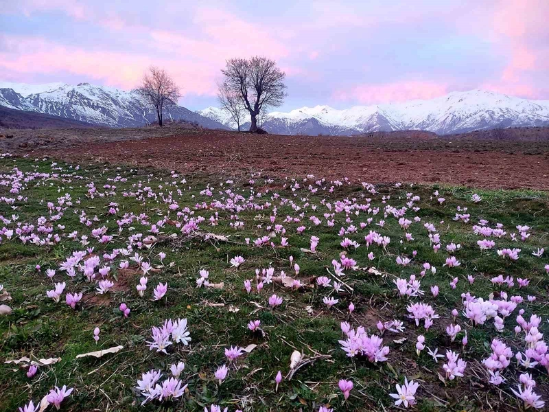 Tarlaları süsleyen çiğdem çiçekleri, çevreye adeta görsel bir şölen sundu. Yüksek kesimlerdeki kar manzarasıyla iç içe açan bu çiçekler, kışın beyazı ile baharın renklerini bir araya getirerek eşsiz manzaralar oluşturdu.