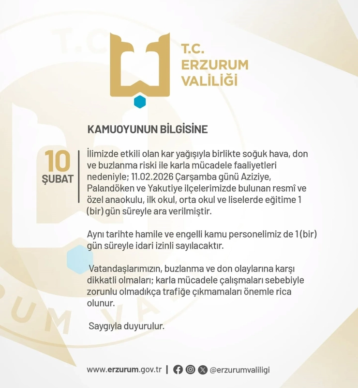 Erzurum Valiliği tarafından konu ile ilgili yapılan açıklamada, "İlimizde etkili olan kar yağışıyla birlikte soğuk hava, don ve buzlanma riski ile karla mücadele faaliyetleri nedeniyle; 11.02.2026 Çarşamba günü Aziziye, Palandöken ve Yakutiye ilçelerimizde bulunan resmî ve özel anaokulu, ilk okul, orta okul ve liselerde eğitime 1 (bir) gün süreyle ara verilmiştir. Aynı tarihte hamile ve engelli kamu personelimiz de 1(bir) gün süreyle idari izinli sayılacaktır.