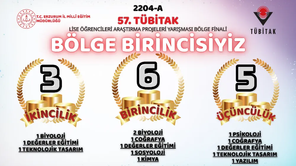 2204-A 57. TÜBİTAK Lise Öğrencileri Araştırma Projeleri Yarışması Bölge Finali, Trabzon’da gerçekleştirildi. Erzurum İl Millî Eğitim Müdürlüğü, farklı alanlarda elde ettiği derecelerle bölge finaline damga vurdu. Erzurum’u temsil eden öğrenciler, 6 birincilik, 3 ikincilik ve 5 üçüncülük olmak üzere toplam 14 derece elde ederek bölge birincisi oldu.