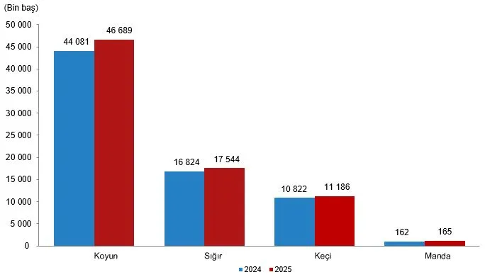 2025 yılı sonunda büyükbaş hayvan sayısı, bir önceki yıla göre %4,3 artarak 17 milyon 709 bin baş oldu.