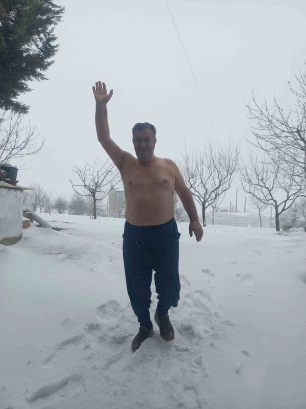 Edinilen bilgiye göre, mahalle sakinlerinden İlhami Çelik, sabah saatlerinde başlayan ve kent genelinde halen etkisini sürdüren kar yağışını üstsüz sokağa çıkarak kutladı. Vücudunun bazı kısımlarını yağan karla ıslatan vatandaş, o anları da cep telefonu kamerası ile kayda aldırdı.