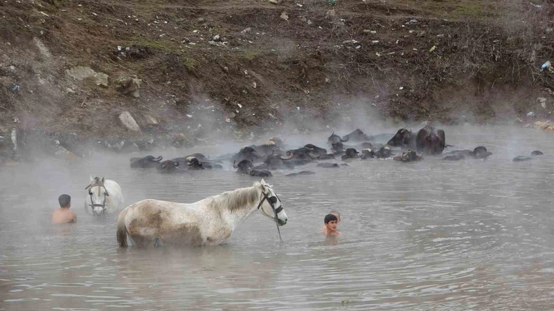 Bitlis’in Güroymak ilçesinde bulunan Budaklı Kaplıcası, temizlenmeleri için getirilen manda ve atlara kış ortasında sıcak su keyfi yaşatıyor. Soğuk havaya rağmen şifalı termal sularda sakin bir şekilde bekleyen hayvanlar, buharın etkisiyle etkileyici görüntüler oluşturuyor.