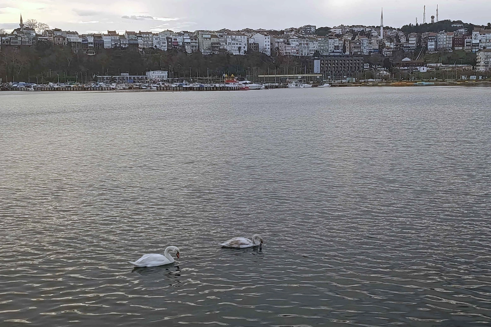 İstanbul'da Şile Limanı’na gelen iki kuğu, rüzgarsız havayı ve limandaki sakinliği fırsat bilerek huzur içinde gezindi. Nadir görülen anlar vatandaşların ilgisini çekti.