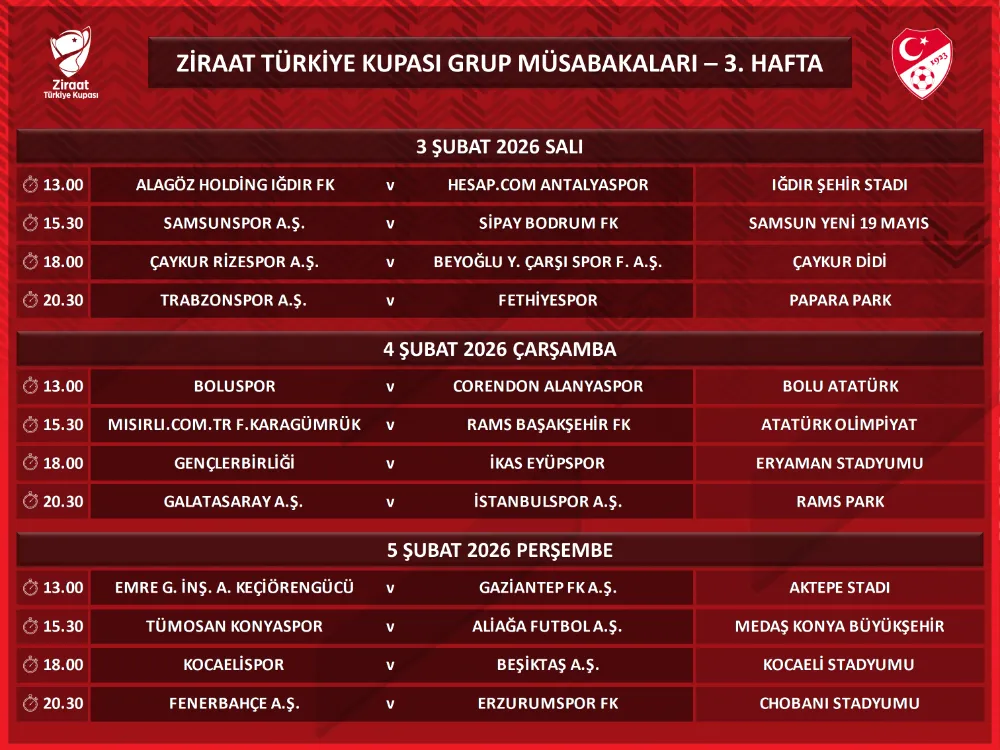 Ziraat Türkiye Kupası grup müsabakalarında 3. hafta maç programı belli oldu. Futbolseverleri üç güne yayılan ve birbirinden kritik karşılaşmaların oynanacağı yoğun bir fikstür bekliyor.